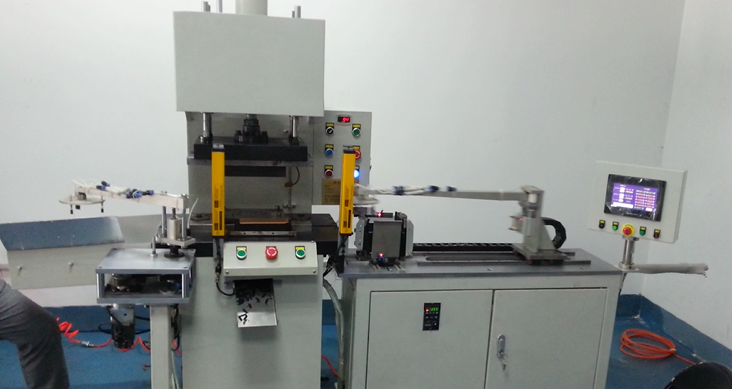 設(shè)備為自動(dòng)上料、沖裁、取料的自動(dòng)化成套設(shè)備,設(shè)備由汽缸抓取料,再由汽缸輸送到壓機(jī)模具上,由壓機(jī)沖裁后,再由伺服驅(qū)動(dòng)旋轉(zhuǎn)抓取,放入料盒。